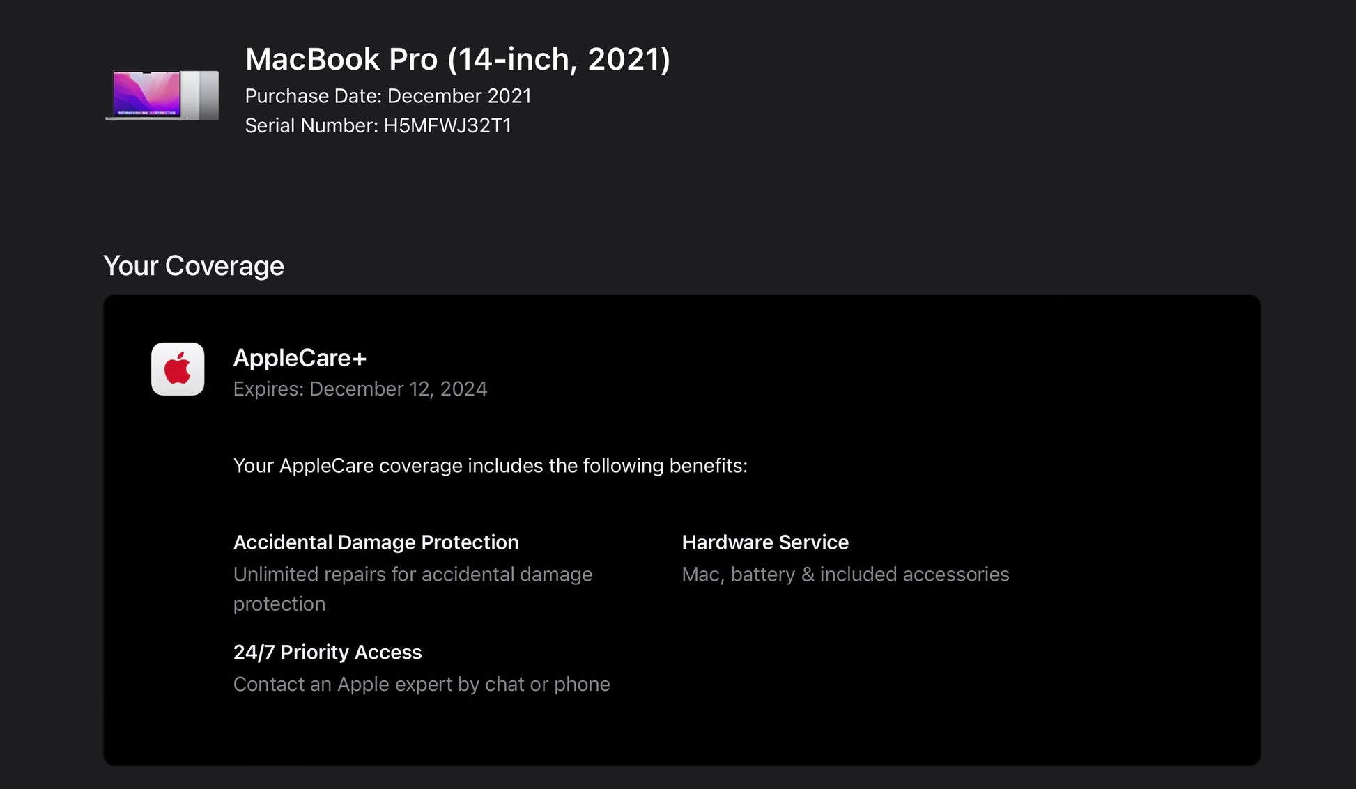 This MacBook Pro is a grade C device, which means it has some visible wear and tear, including scratches and scuffs on the exterior. There are a few small dents on the corners. However, the screen is in good condition, with no major scratches or cracks. The battery has been well cared for, with only 131 cycles! And retains excellent charge capacity. The device has been tested and is in full working order, with all features functioning properly, including the keyboard, touchpad, and ports. It comes with original accessories including a charger, and an Apple box (if it's available). it also comes with the added bonus of AppleCare+ until 12/12/2024, ensuring that you'll have peace of mind knowing that your investment is protected. Please refer to the pictures for a better understanding of the condition.