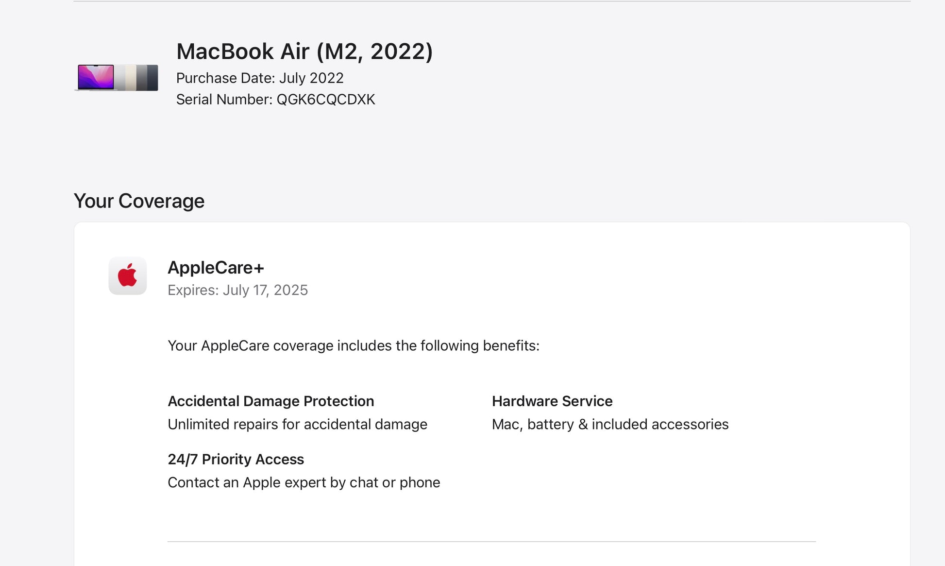 This MacBook Air is in very good condition with minimal signs of wear, such as light dents and markings. The MacBook's keyboard and trackpad are in perfect working order, and the display is bright and clear. The battery has been well cared for, with only 235 cycles! And retains excellent charge capacity. This MacBook Pro has been thoroughly tested and reset to factory settings, ensuring that it's ready for its new owner to use right out of the box. It comes with original accessories, including a charger and an Apple box (if it's available). it also comes with the added bonus of AppleCare+ until 7/17/2025, ensuring that you'll have peace of mind knowing that your investment is protected. Please refer to the pictures for a better understanding of the condition.